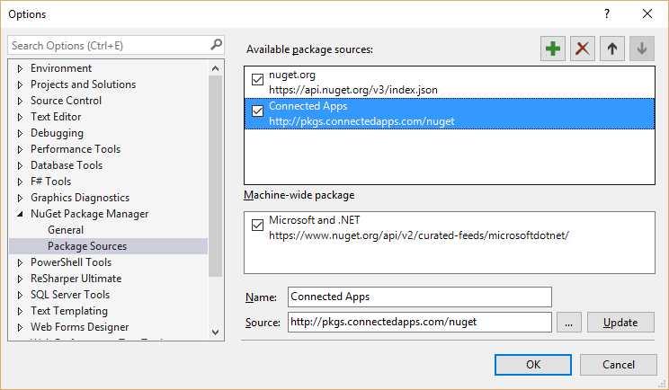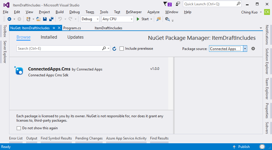 When you manage packages for a project, switch the package source to “Connected Apps”. You’ll see the “ConnectedApps.Cms” package that you can install.